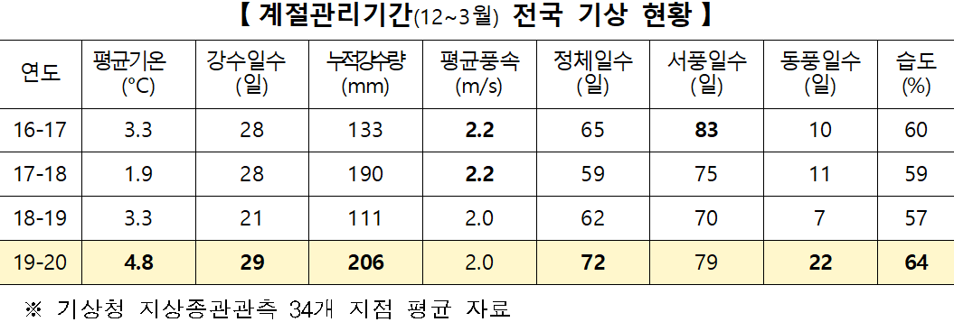 다음으로, 계절관리제 기간 동안 기상여건의 경우 지난해 같은 시기와 비교하여 다소 유리하게 작용한 것으로 판단됩니다.