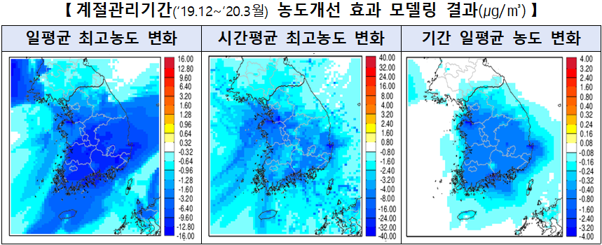 전국 평균농도 개선효과는 계절관리제 전반기(2019년 12월~2020년 1월)에 1.4㎍/㎥, 후반기(2020년 2월~3월)에 2.5㎍/㎥로 나타났으며, 전체기간 동안 약 1.9㎍/㎥가 줄어들었다.