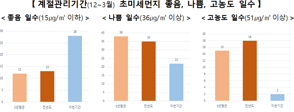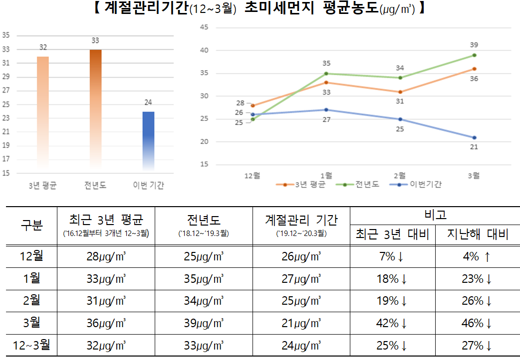 먼저 계절관리제 시행 기간 석탄발전소, 사업장, 항만·선박 분야 등 여러 부문에서 미세먼지 배출 감축 조치를 시행함에 따라, 초미세먼지 농도 개선에 효과가 있었던 것으로 판단됩니다.